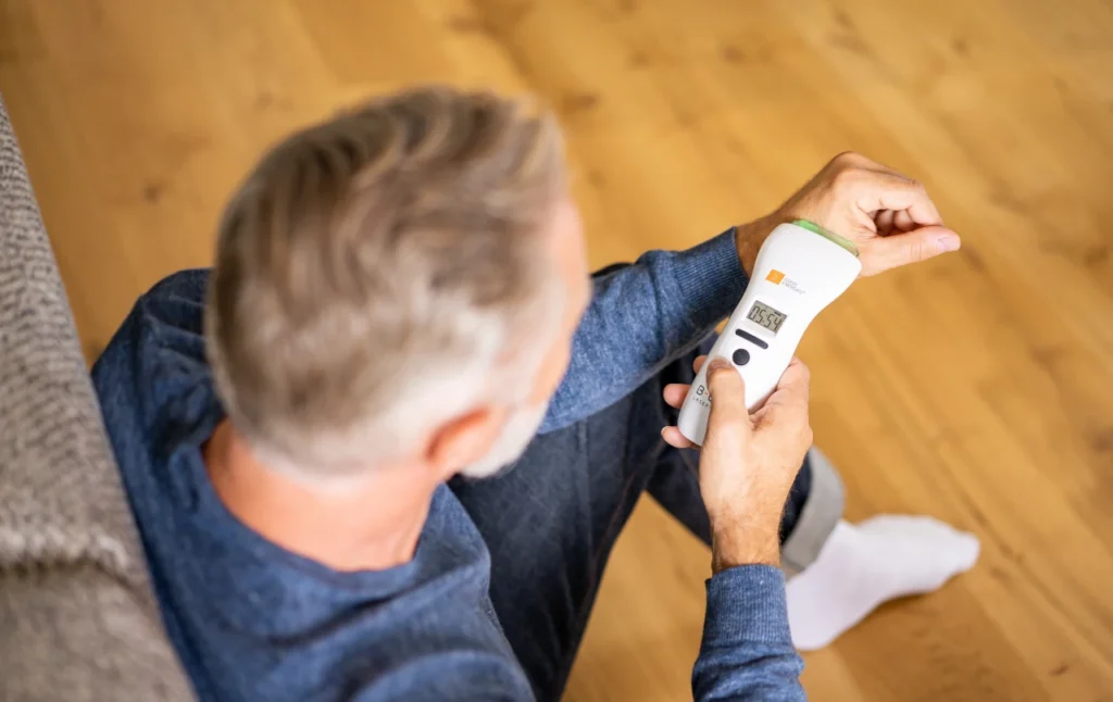 The device is lightly applied directly over the skin and held without moving from 1.5 to 6 minutes on each treatment point. Time is increased gradually over the course of the treatment. For convenient hands-free use, an adjustable stand allows the device to be stabilised on any surface and attached to furniture or the different parts of your body. This will free you to engage in other activities while receiving your recommended twice-daily treatment.