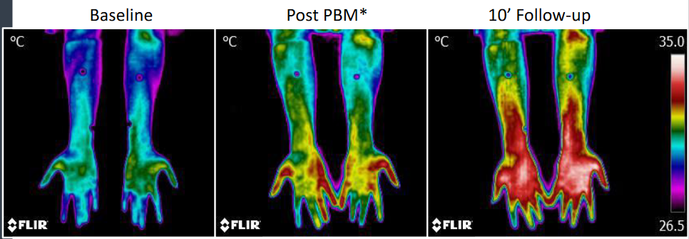 Note that the increase in skin temperature continued to rise even after the PBM was discontinued, suggesting the potential to improve tissue perfusion*.